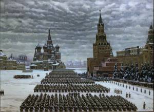 Несмотря на тяжелое положение на фронте, 7 ноября 1941 г. на Красной площади состоялся военный парад. Сталин выступил с патриотической речью. Это произвело колоссальное впечатление на советских граждан, вселив в них уверенность в победе. С парада войска шли на передовую.